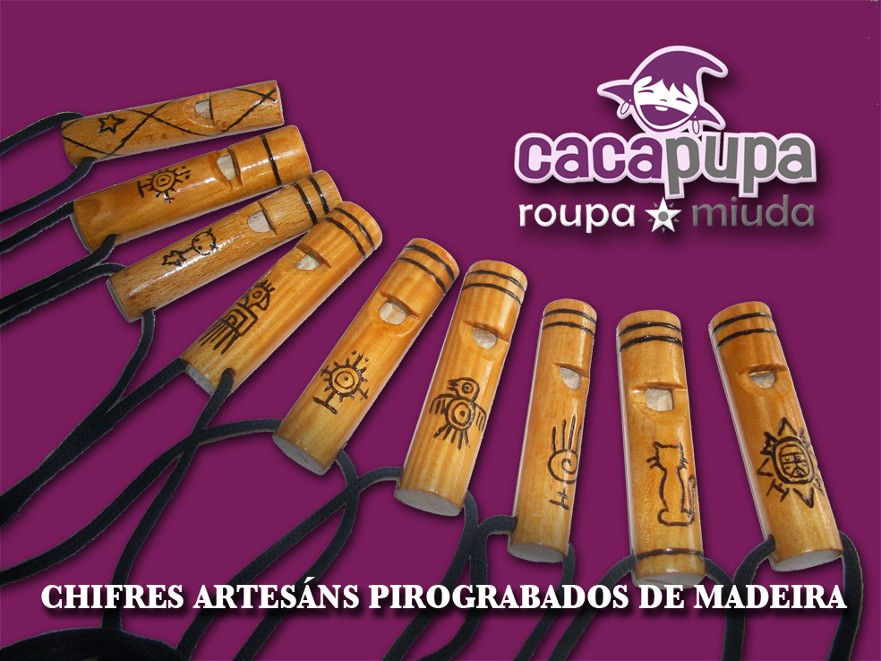 Chifres pirograbados de madeira